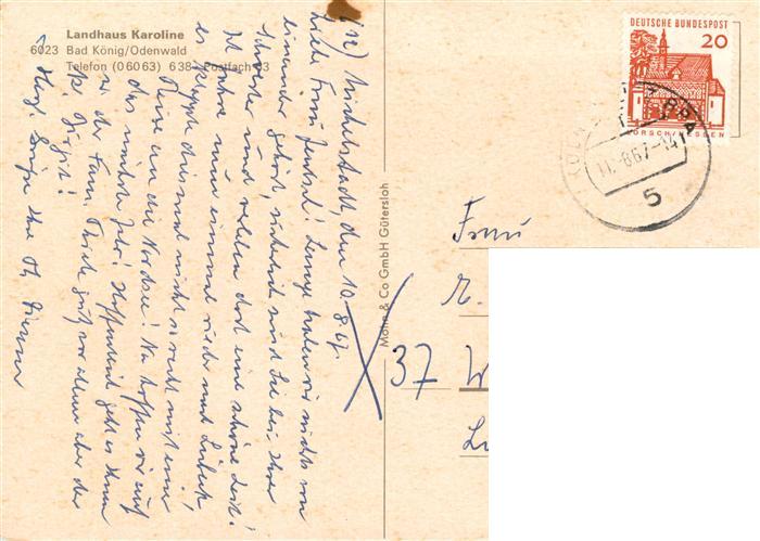 73879224 alte Postkarte Bad Koenig Odenwald Pension Landhaus Karoline Gastraum postalisch gelaufen Erhaltung siehe scans [WerneD78] KatCode: 11110006437001