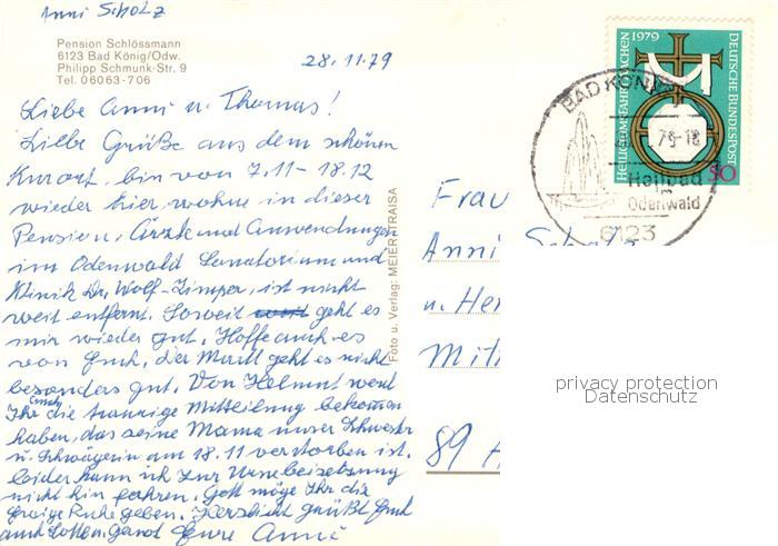 73780087 alte Postkarte Bad Koenig Odenwald Pension Schloessmann postalisch gelaufen Erhaltung siehe scans [FriedD77] KatCode: 11110006437001