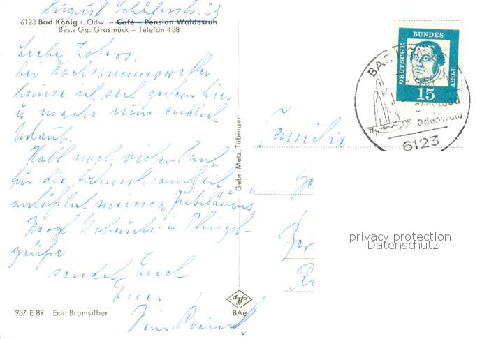 43354475 alte Postkarte Bad Koenig Odenwald Pension Waldesruh Restaurant Terrasse Stadtbild mit Kirche Bromsilber postalisch gelaufen Erhaltung siehe scans [FriedD77] KatCode: 11110006437001