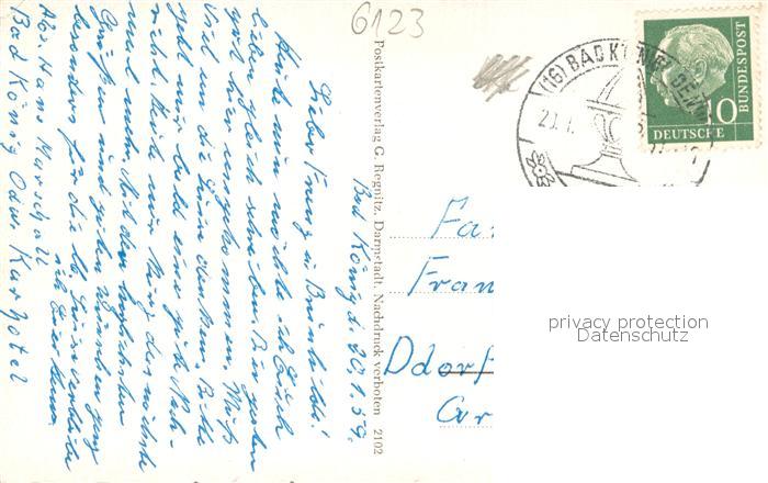 73698059 alte Postkarte Bad Koenig Odenwald Schloss Kurgarten Sanatorium Ortsansicht mit Kirche postalisch gelaufen Erhaltung siehe scans [FriedD77] KatCode: 11110006437001