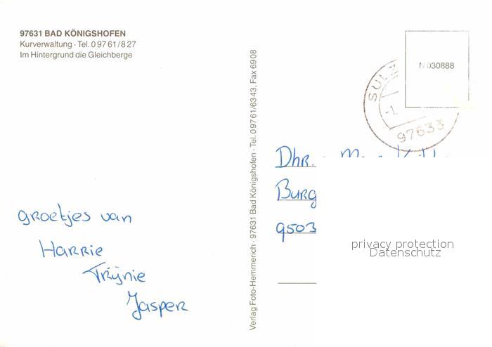 72764349 alte Postkarte Bad Koenigshofen Kirche Gleichberge postalisch gelaufen Erhaltung siehe scans [AndreD76] KatCode: 11110009673141