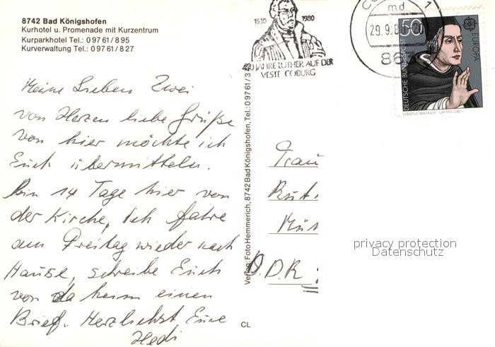 73012037 alte Postkarte Bad Koenigshofen Kurhotel und Promenade mit Kurzentrum postalisch gelaufen Erhaltung siehe scans [WerneD78] KatCode: 11110009673141