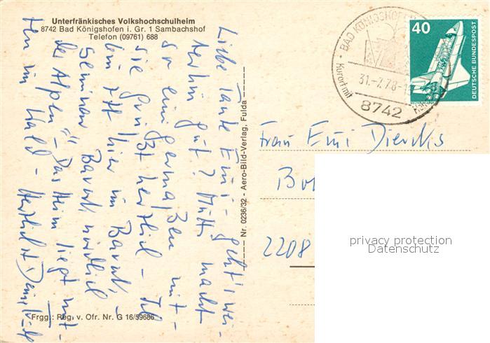 73103277 alte Postkarte Bad Koenigshofen Unterfraenkisches Volkshochschulheim Fliegeraufnahme postalisch gelaufen Erhaltung siehe scans [WerneD78] KatCode: 11110009673141