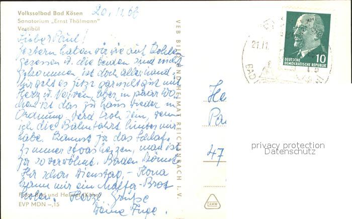 71903045 alte Postkarte Bad Koesen Sanatorium Ernst Thaelmann Vestibuel Volkssolbad postalisch gelaufen Erhaltung siehe scans KatCode: 11110015084020