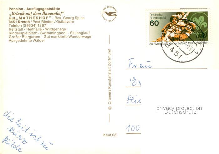 73646199 alte Postkarte Bad Kreuth Pension Ausflugsgaststaette Urlaub auf dem Bauernhof Gut Matheshof Reitsport postalisch gelaufen Erhaltung siehe scans [FriedD77] KatCode: 11110009182124