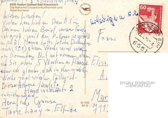73093600 alte Postkarte Bad Kreuznach Crucenia-Kurthermen Hotel Kurhaus postalisch gelaufen Erhaltung siehe scans [NatalD47] KatCode: 11110007133006