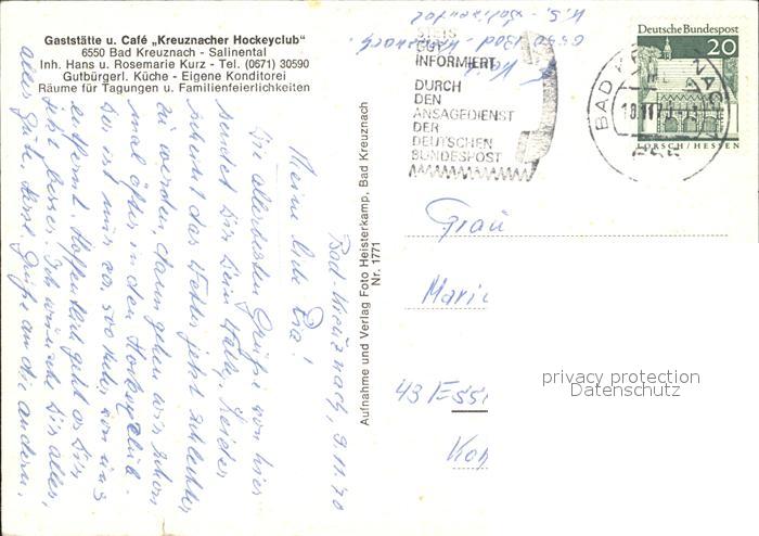 72114450 alte Postkarte Bad Kreuznach Gaststaette Cafe Kreuznacher Hockeyclub Salinental postalisch gelaufen Erhaltung siehe scans KatCode: 11110007133006