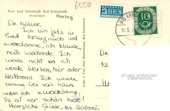 73691123 alte Postkarte Bad Kreuznach Oranienpark Kur- und Weinstadt postalisch gelaufen Erhaltung siehe scans [FriedD77] KatCode: 11110007133006