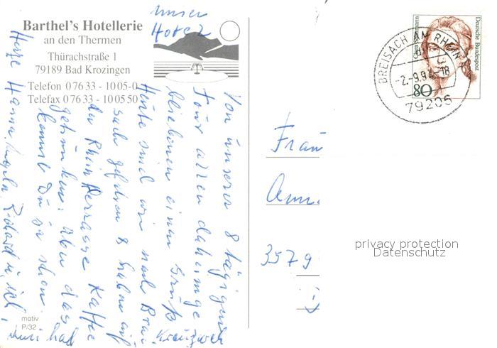 73192592 alte Postkarte Bad Krozingen Barthels Hotellerie postalisch gelaufen Erhaltung siehe scans [NatalD47] KatCode: 11110008315006