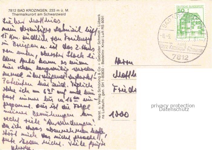 74156678 alte Postkarte BAD KROZINGEN Belchen Thermalkurort Schwarzwald Rheinebene Kurklinik Felder Stadtansicht postalisch gelaufen Fliegeraufnahme Erhaltung siehe scans [Karloger] KatCode: 11110008315006