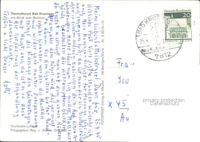 72522538 alte Postkarte Bad Krozingen Fliegeraufnahme mit Blick zum Belchen postalisch gelaufen Erhaltung siehe scans KatCode: 11110008315006