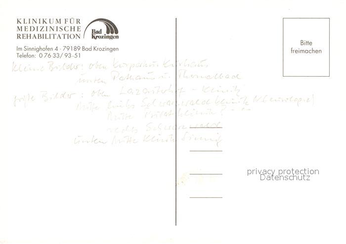 73164354 Bad Krozingen Klinik fuer Med Rehabilitation Details postalisch nicht gelaufen Erhaltung siehe scans [WerneD78] KatCode: 11110008315006