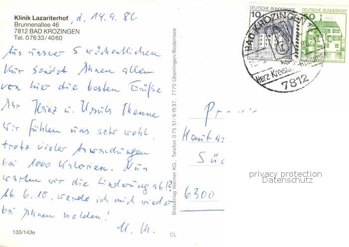 72772051 alte Postkarte Bad Krozingen Klinik Lazariterhof postalisch gelaufen Erhaltung siehe scans [LiesaD40] KatCode: 11110008315006