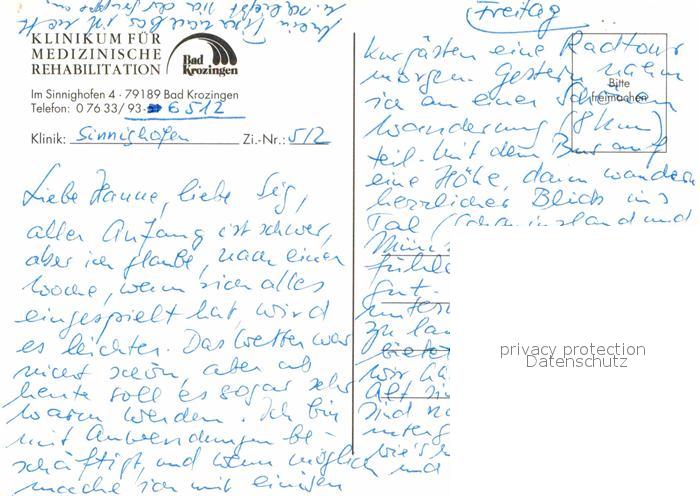 72819650 Bad Krozingen Klinikum fuet medizinische Rehabilitation postalisch nicht gelaufen Erhaltung siehe scans [NatalD47] KatCode: 11110008315006