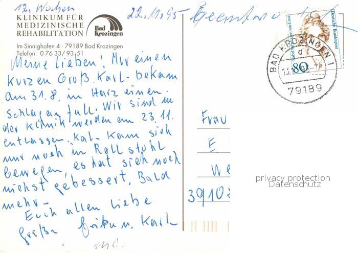 72902841 alte Postkarte Bad Krozingen Klinikumfuer Medizinische Rehabilitation postalisch gelaufen Erhaltung siehe scans [AndreD76] KatCode: 11110008315006