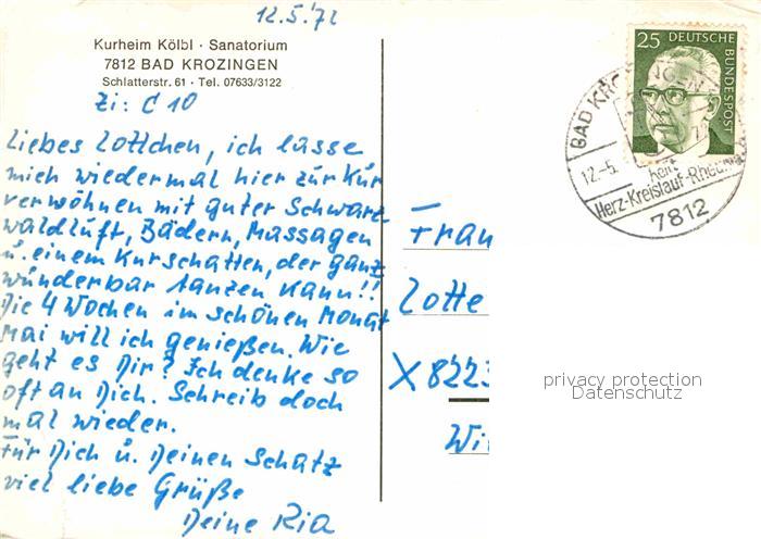 72791273 alte Postkarte Bad Krozingen Kurheim Koelbl Sanatorium postalisch gelaufen Erhaltung siehe scans [LiesaD40] KatCode: 11110008315006
