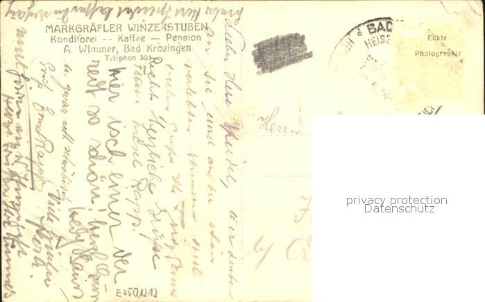 31840714 alte Postkarte Bad Krozingen Markgraefler Winzerstuben A. Wimmer postalisch gelaufen Erhaltung siehe scans KatCode: 11110008315006