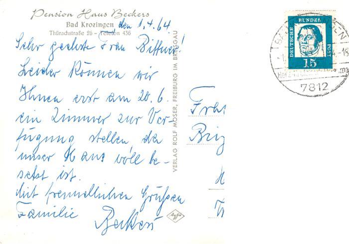 73873675 alte Postkarte Bad Krozingen Pension Haus Beckers postalisch gelaufen Erhaltung siehe scans [FriedD77] KatCode: 11110008315006