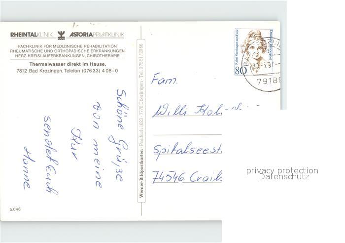 72331703 alte Postkarte Bad Krozingen Rheintalklinik mit Astoria Privatklinik Zimmer Speisesaal postalisch gelaufen Erhaltung siehe scans KatCode: 11110008315006