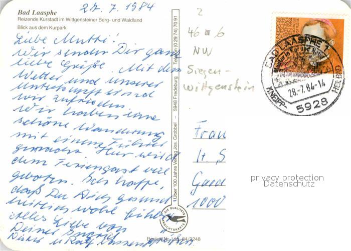 72907477 alte Postkarte Bad Laasphe Kurpark postalisch gelaufen Erhaltung siehe scans [AndreD76] KatCode: 11110005970028