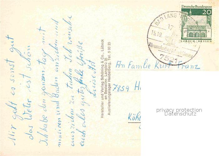 72859097 alte Postkarte Bad Langenbruecken Bad Schoenborn Kurhaus Rathaus Kraichgauhalle Kurpark Schwefelbad postalisch gelaufen Erhaltung siehe scans [AndreD76] KatCode: 11110008215100