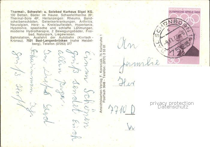 72069064 alte Postkarte Bad Langenbruecken Bad Schoenborn Thermalbad Kurhaus Sigel KG postalisch gelaufen Erhaltung siehe scans KatCode: 11110008215100