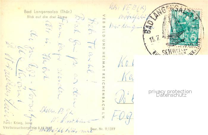 73043301 alte Postkarte Bad Langensalza Blick auf die drei Tuerme postalisch gelaufen Erhaltung siehe scans [WerneD78] KatCode: 11110016064003