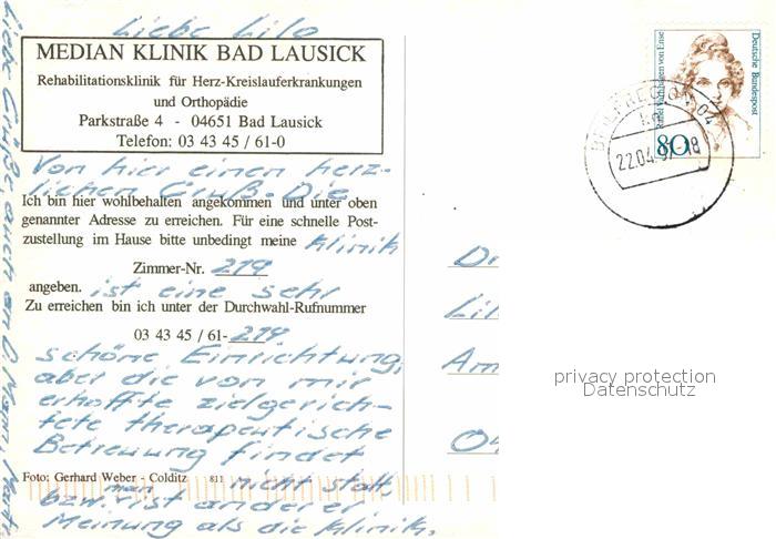 72804878 alte Postkarte Bad Lausick Median Klinik Rehaklinik Teich postalisch gelaufen Erhaltung siehe scans [FriedD77] KatCode: 11110014383020