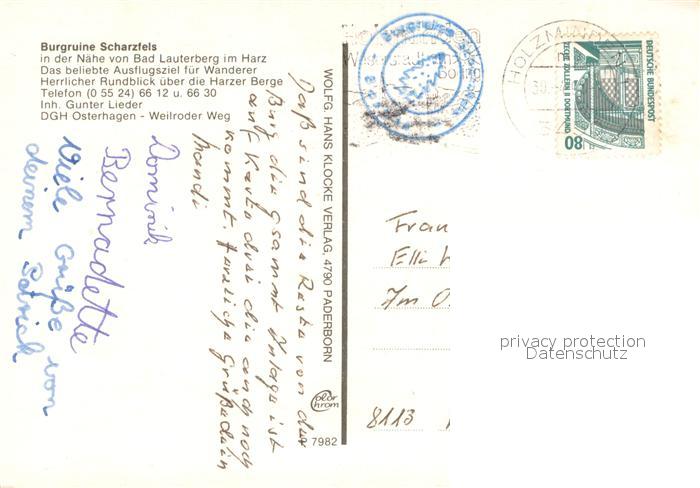 73677829 alte Postkarte Bad Lauterberg Burgruine Scharzfels Gaststaette Gaststube Terrasse postalisch gelaufen Erhaltung siehe scans [WerneD78] KatCode: 11110003156002