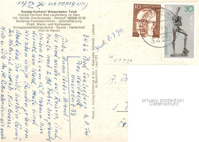 73005212 alte Postkarte Bad Lauterberg Kneipp Kurhotel Wiesenbeker Teich postalisch gelaufen Erhaltung siehe scans [WerneD78] KatCode: 11110003156002