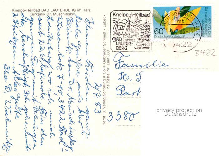 72909950 alte Postkarte Bad Lauterberg Kurklinik Dr. Muschinsky postalisch gelaufen Erhaltung siehe scans [LiesaD40] KatCode: 11110003156002
