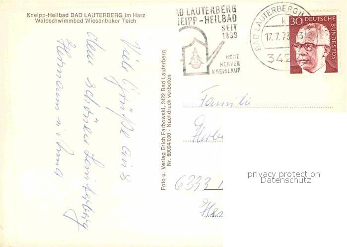 72852816 alte Postkarte Bad Lauterberg Waldschwimmbad Wiesenbeker Teich Kneipp Heilbad postalisch gelaufen Erhaltung siehe scans [FriedD77] KatCode: 11110003156002