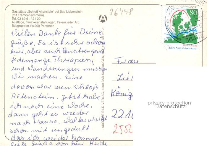 73568889 alte Postkarte Bad Liebenstein Gastst?tte Schloss Altenstein postalisch gelaufen Erhaltung siehe scans [PaolaD17] KatCode: 11110016063002