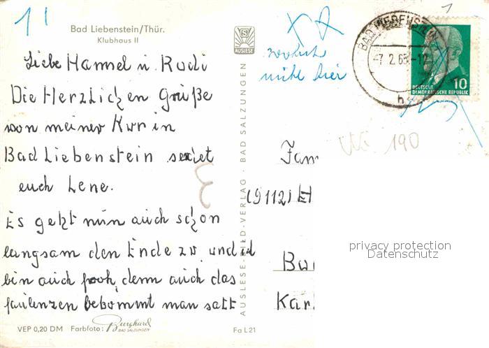 72653501 alte Postkarte Bad Liebenstein Klubhaus postalisch gelaufen Erhaltung siehe scans [WerneD78] KatCode: 11110016063002
