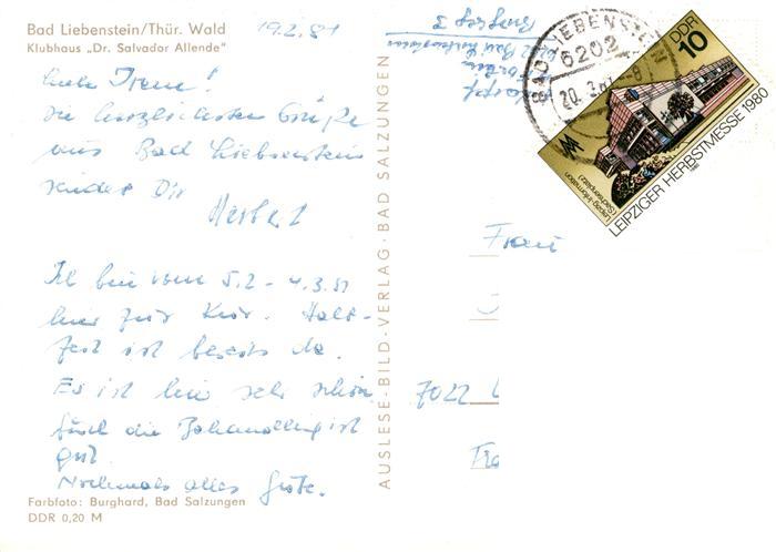 73905492 alte Postkarte Bad Liebenstein Klubhaus Dr Salvador Allende postalisch gelaufen Erhaltung siehe scans [FriedD77] KatCode: 11110016063002