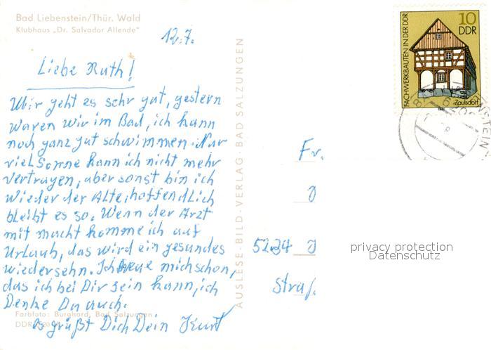 73104746 alte Postkarte Bad Liebenstein Klubhaus Dr Salvador Allende postalisch gelaufen Erhaltung siehe scans [WerneD78] KatCode: 11110016063002