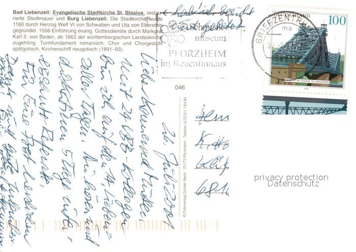 73119946 alte Postkarte Bad Liebenzell Evangelische Stadtkirche Sankt Blasius postalisch gelaufen Erhaltung siehe scans [KathaD81] KatCode: 11110008235008