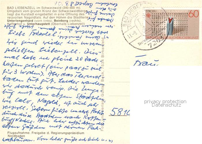 73322106 alte Postkarte Bad Liebenzell Fliegeraufnahme postalisch gelaufen Erhaltung siehe scans [KathaD81] KatCode: 11110008235008