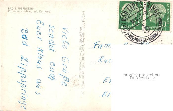 73321121 alte Postkarte Bad Lippspringe Fliegeraufnahme Kaiser Karls Park Kurhaus postalisch gelaufen Erhaltung siehe scans [KathaD81] KatCode: 11110005774008