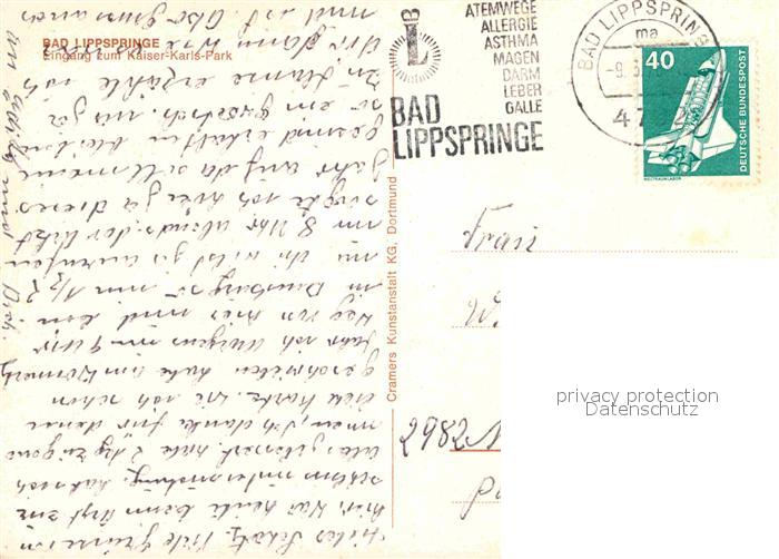 72658234 alte Postkarte Bad Lippspringe Kaiser Karls Park postalisch gelaufen Erhaltung siehe scans [AndreD76] KatCode: 11110005774008
