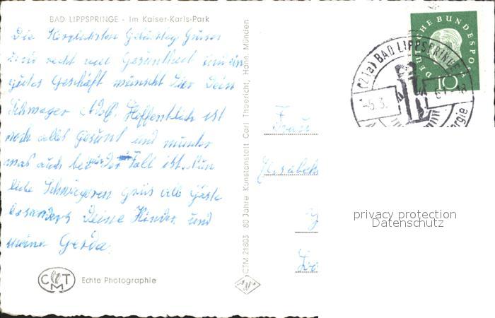 72198673 alte Postkarte Bad Lippspringe Kaiser-Karls- Park postalisch gelaufen Erhaltung siehe scans KatCode: 11110005774008