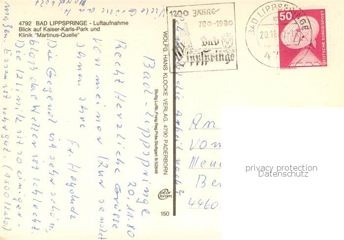 73765720 alte Postkarte Bad Lippspringe Kaiser Karls Park und Klinik Martinus Quelle Fliegeraufnahme postalisch gelaufen Erhaltung siehe scans [WerneD78] KatCode: 11110005774008