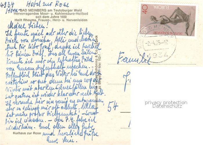 73721697 alte Postkarte Bad Meinberg Hotel zur Rose postalisch gelaufen Erhaltung siehe scans [WerneD78] KatCode: 11110005766032