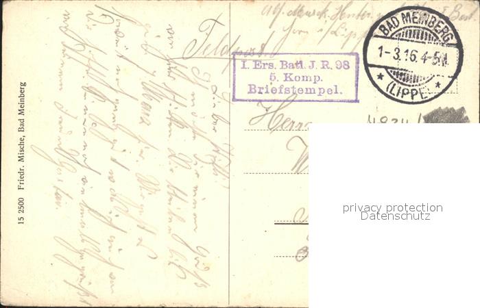 31841218 alte Postkarte Bad Meinberg Logierhaus I. Ers. Batl. J.R. 98 5. Komp. postalisch gelaufen Feldpost Erhaltung siehe scans KatCode: 11110005766032