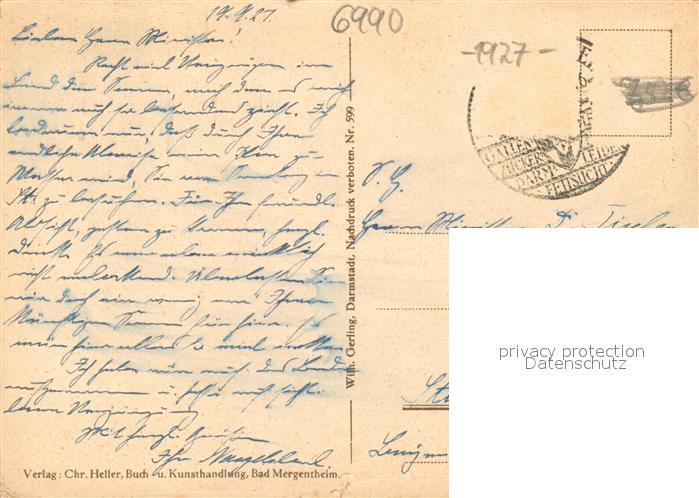 73695438 alte Postkarte Bad Mergentheim Burgstrasse mit Milchlingsbrunnen und Moerikehaus postalisch gelaufen Erhaltung siehe scans [FriedD77] KatCode: 11110008128007
