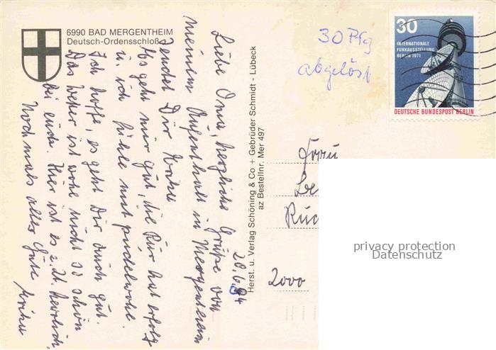 74153784 alte Postkarte BAD MERGENTHEIM BW Deutsch-Ordensschloss postalisch gelaufen Erhaltung siehe scans [FriedD77] KatCode: 11110008128007