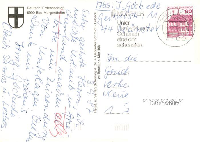 73266044 alte Postkarte Bad Mergentheim Deutschordensschloss postalisch gelaufen Erhaltung siehe scans [FriedD77] KatCode: 11110008128007