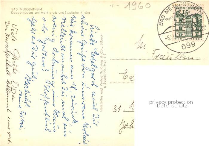 73290865 alte Postkarte Bad Mergentheim Doppelhaeuser am marktplatz mit Stadtpfarrkirche postalisch gelaufen Erhaltung siehe scans [WerneD78] KatCode: 11110008128007