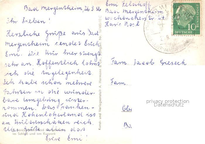 73734694 alte Postkarte Bad Mergentheim Durchblick zum Schloss postalisch gelaufen Erhaltung siehe scans [WerneD78] KatCode: 11110008128007