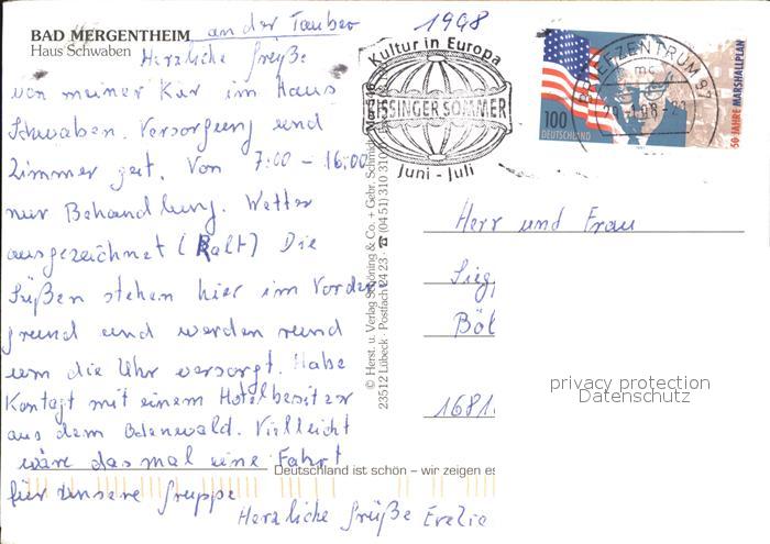 72606247 alte Postkarte Bad Mergentheim Haus Schwaben postalisch gelaufen Erhaltung siehe scans [AndreD76] KatCode: 11110008128007